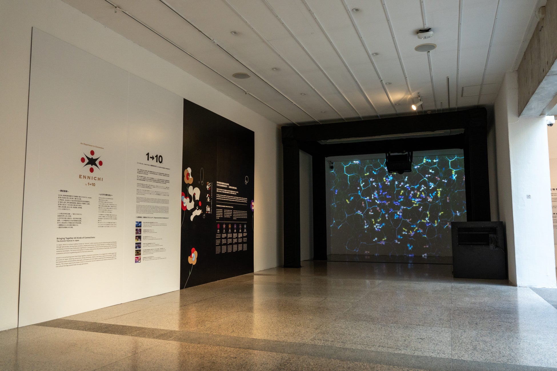 「Synergistic Rhythm」をテーマに、京都生まれの若手アーティストで、 近年大きな賞を受賞し国際的な注目を集めている上野裕二氏の作品と、ワントゥーテンによるデジタルインタラクティブアート彩金魚(いろどりきんぎょ)が展示されます。