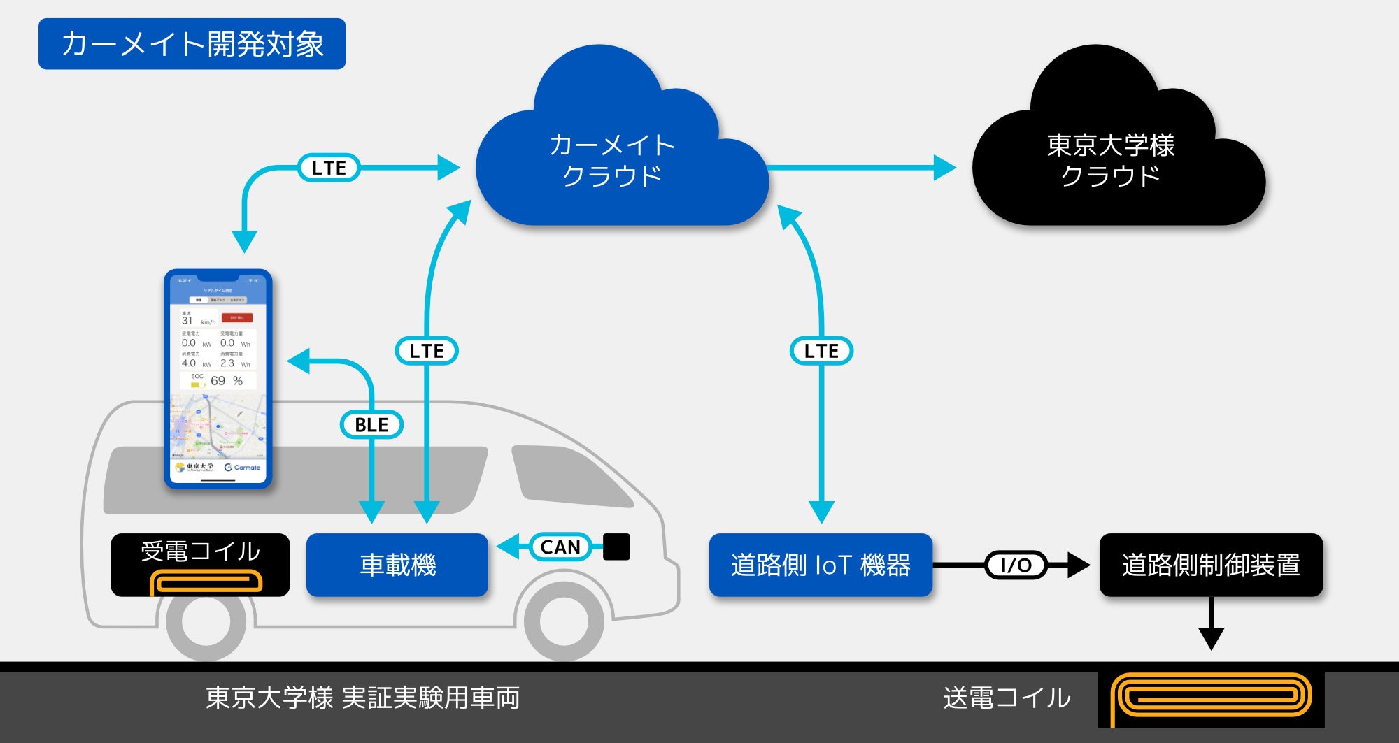 株式会社カーメイト(本社:東京都豊島区)は、東京大学、柏市、その他関係機関と共に、電気自動車を走行中に給電する技術の開発に取り組んでおり、2023年10月から実施される日本初の公道実証実験(柏の葉スマートシティ内)にも参画しています。当社は車載機器と送電コイルの制御装置間の通信技術に携わっており、走行中の給電状況などのデータをスマートフォンアプリで可視化するシステムを東京大学大学院新領域創成科学研究科の藤本・清水研究室(以下、東大グループ)と共同で開発いたしました。このシステムは、実験用の車両に搭載された車載機器と、データ処理を行うクラウドサーバー、及びスマートフォンアプリで構成されております。