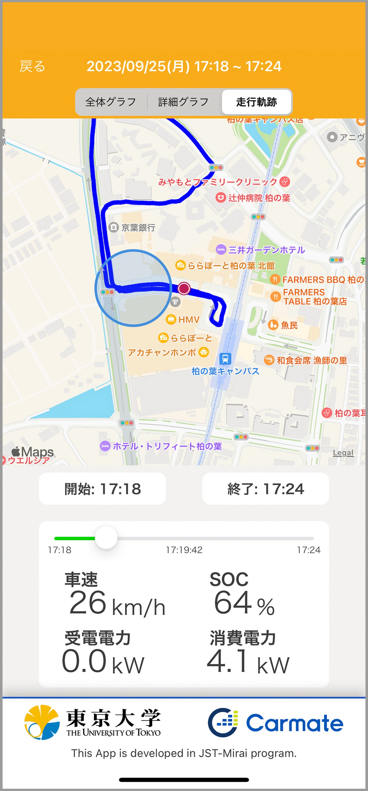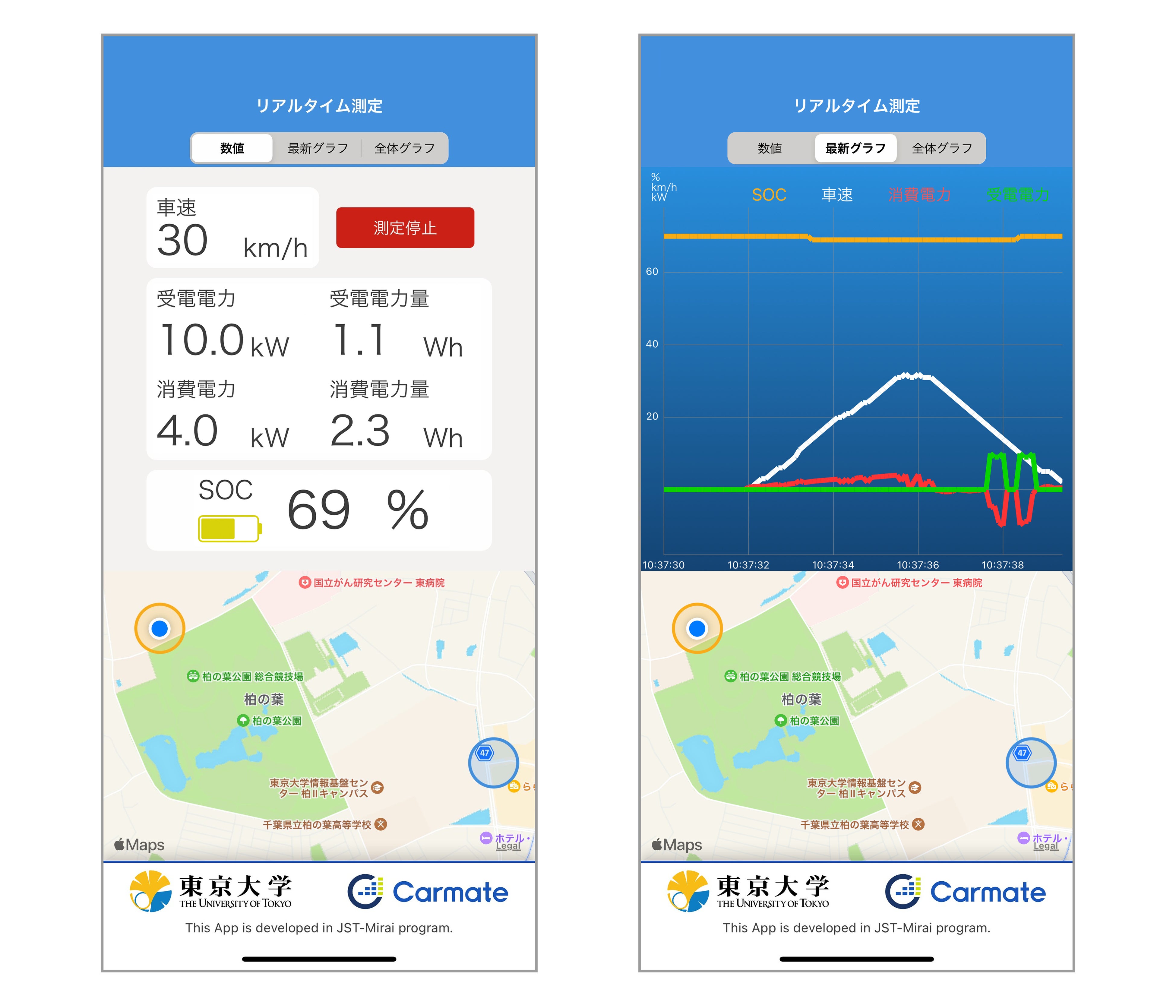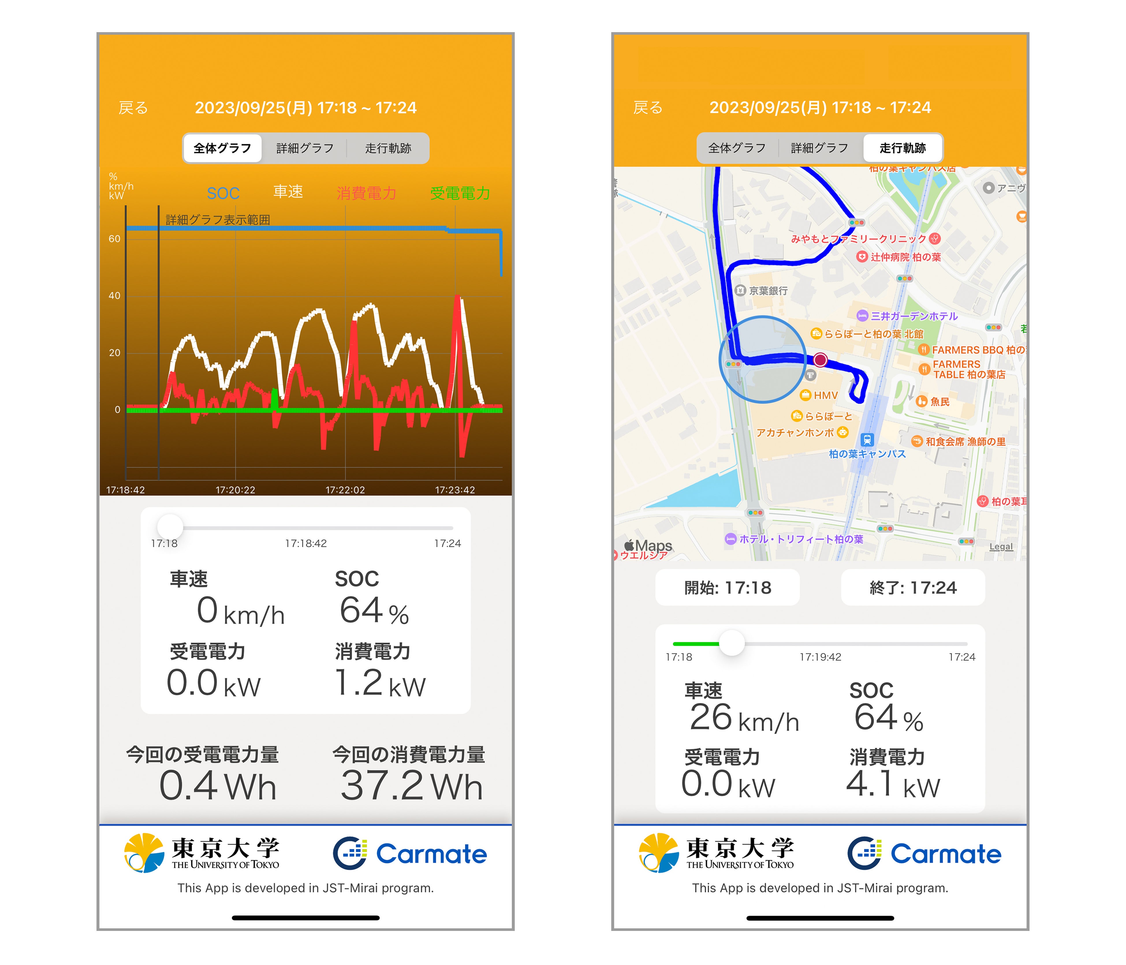 スマートフォンアプリでは、走行中に車両から取得した情報(車速、受電電力、消費電力、バッテリー残量、位置情報)を数値やグラフ、地図で可視化し、以下2つの方法で確認することができます。