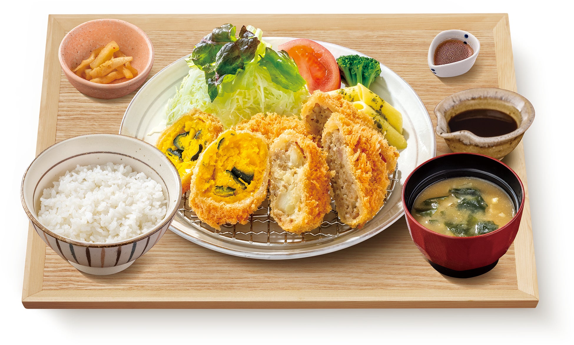 かぼちゃコロッケ、ポテトコロッケ、メンチカツの盛り合わせ定食