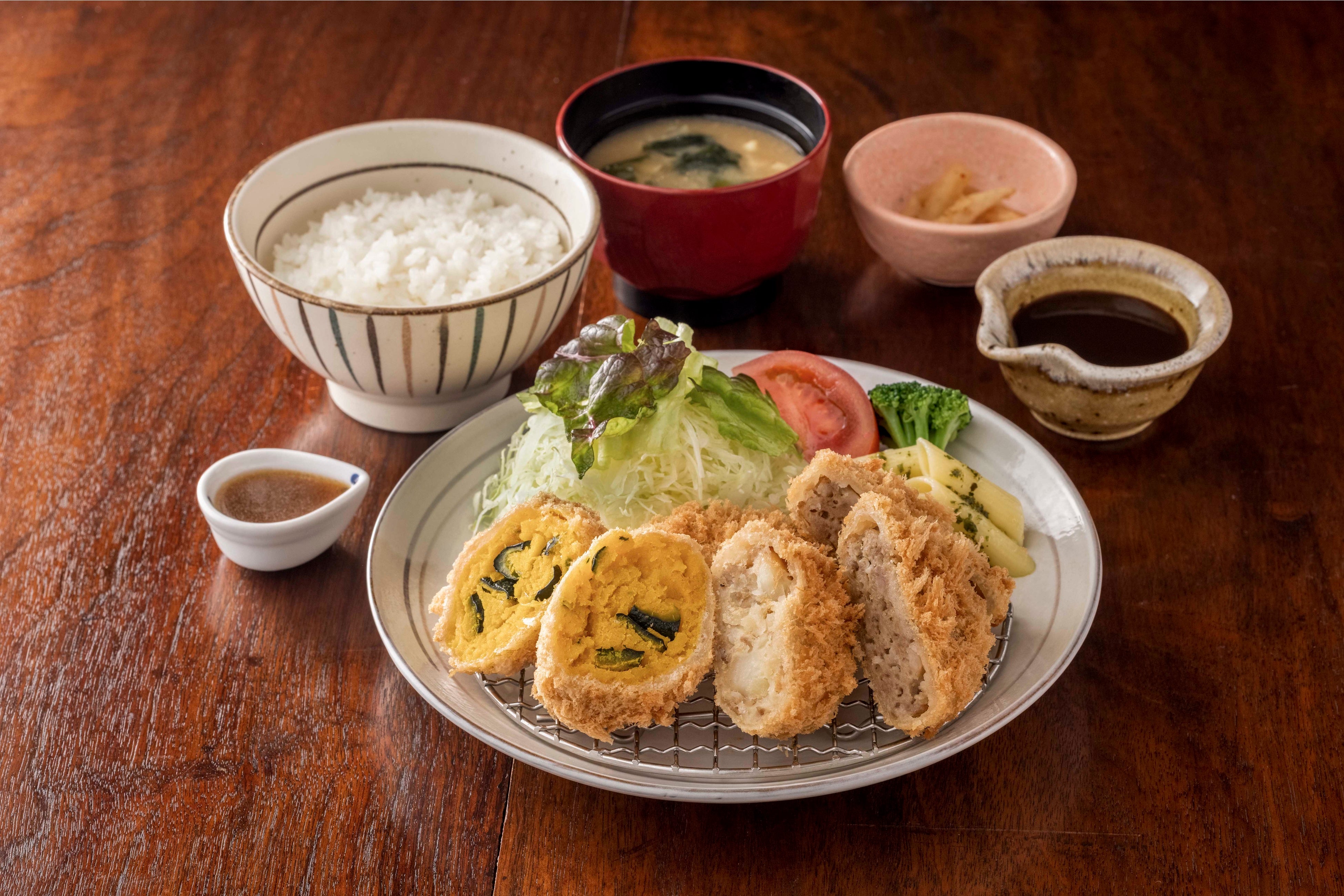 大戸屋名物のかぼちゃコロッケに、やさしい味のポテトコロッケ、揚げたてのメンチカツ。