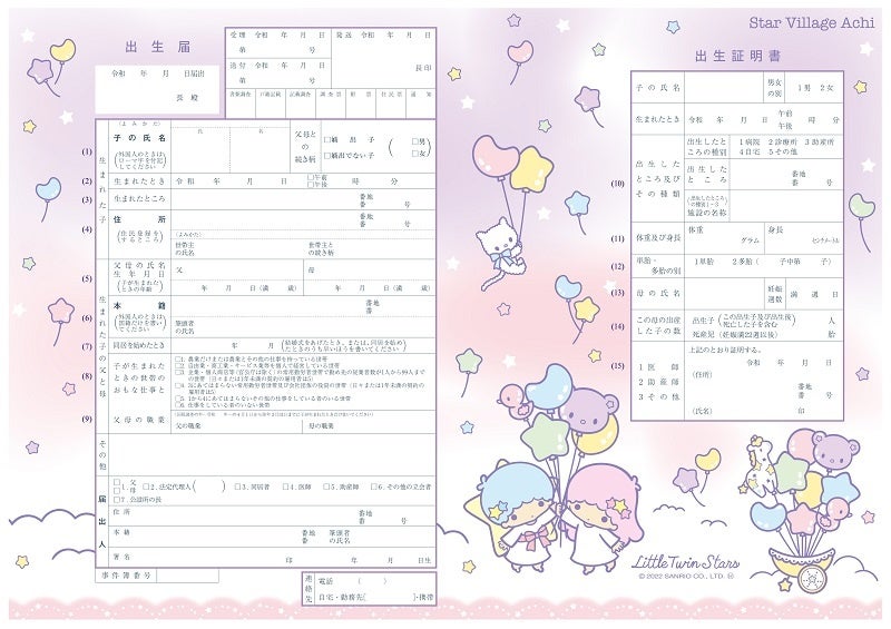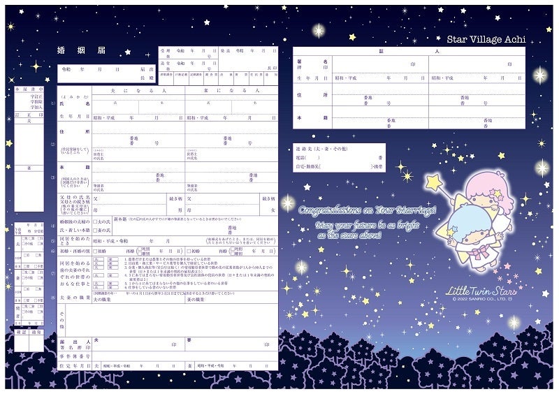 日本一の星空 長野県阿智村(村長:熊谷秀樹)は、星の親善大使 リトルツインスターズ キキ&ララがデザインされたオリジナル婚姻届と、オリジナル出生届を企画、作成して2022年8月24日(水)から利用を開始いたします。