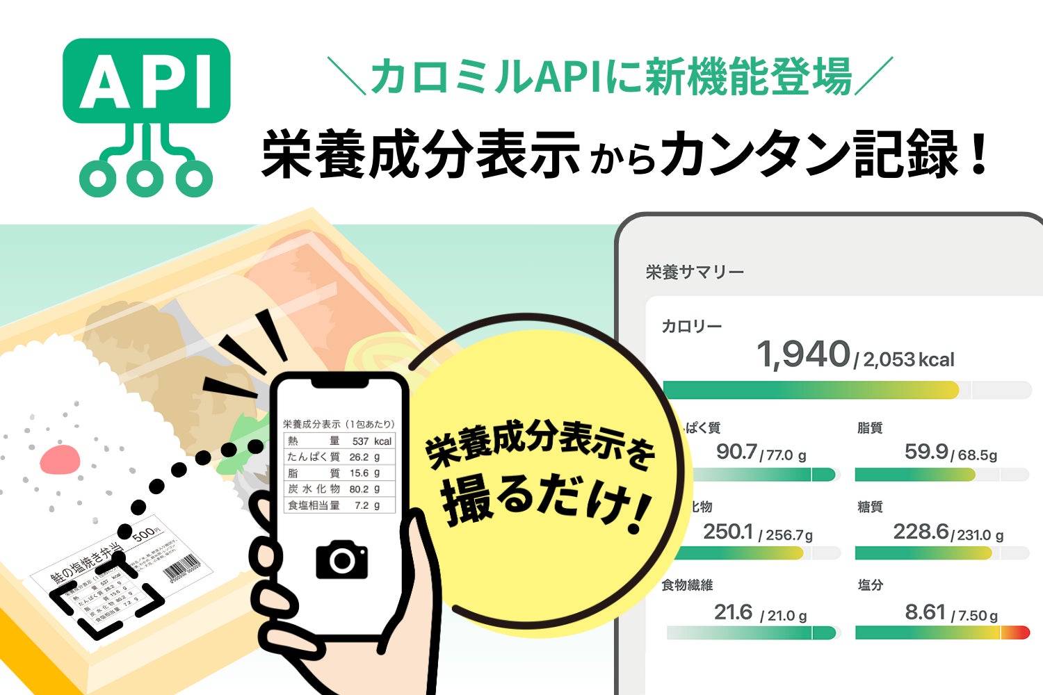 今回、さらなる利便性向上を目指し「カロミル」アプリでもご好評いただいている「栄養成分表示から食事記録できる機能」を、「カロミルAPI」でも提供開始します。