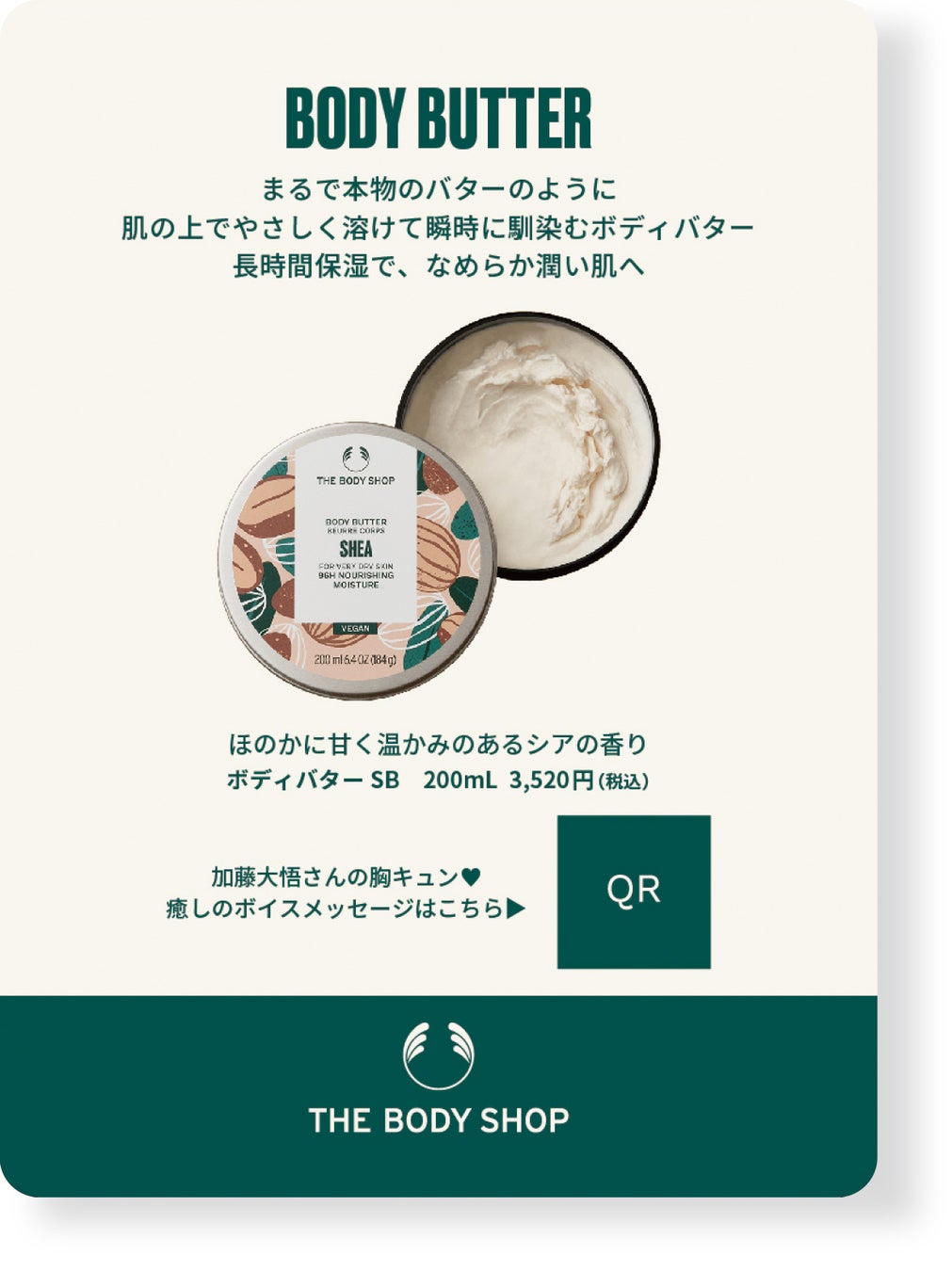 ボディバター200mLを1個お買い上げごとに、ボイスメッセージが聞けるQRコード付き撮りおろしオリジナルトレカを1枚差し上げます。