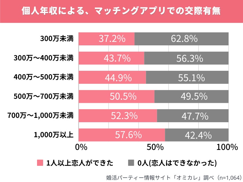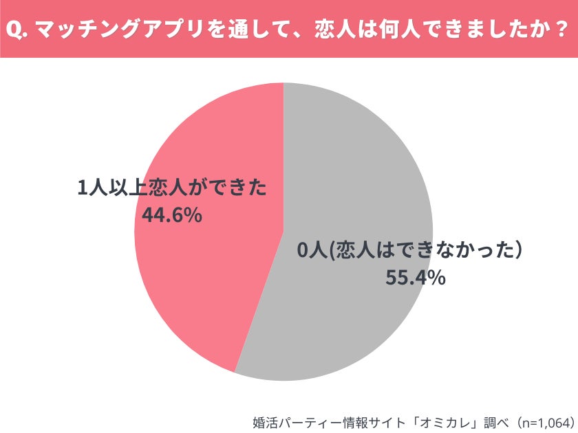 マッチングアプリ利用者のうち「1人以上恋人ができた」と回答した人は、全体の44.6%となりました。