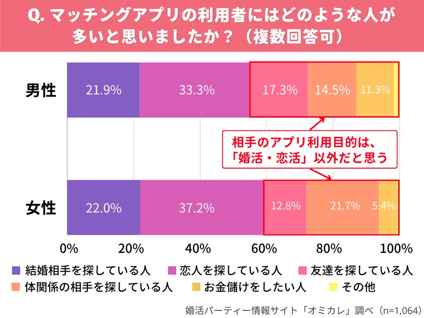 会員数86万人を突破した婚活パーティー掲載数 日本NO.1(※)の婚活情報サイト『オミカレ』を運営する株式会社オミカレ(本社:東京都渋谷区、代表取締役:下永田真人)は、マッチングアプリ利用経験のある20歳以上の男女1,067名を対象に、マッチングアプリ利用実態調査アンケートを実施し、レポートを公開しましたので、ご報告いたします。