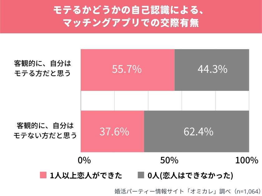 「客観的に、ご自身は異性からモテる方だと思いますか?」という質問に対して、「かなりモテる方だと思う」「どちらかというとモテる方だと思う」と回答した人のうち、55.7%は「1人以上恋人ができた」と回答。