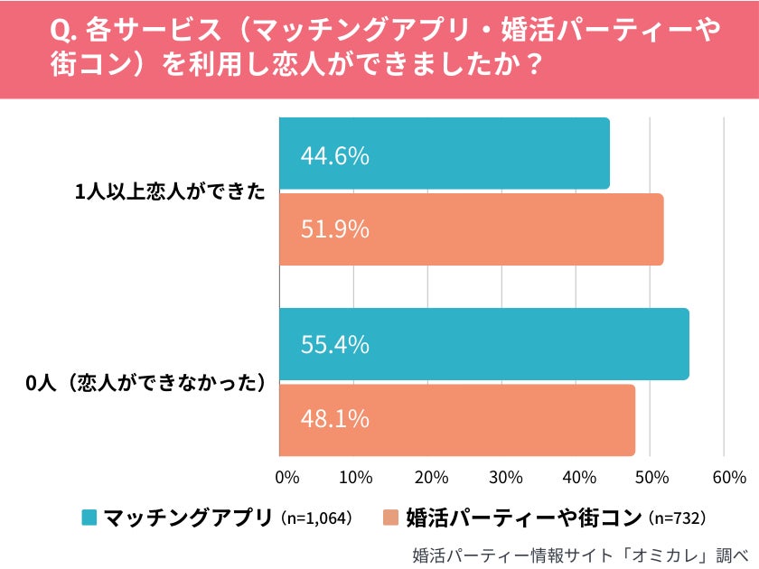 マッチングアプリでは半数以上が「恋人ができなかった」と回答しているのに対して、婚活パーティー・街コンに参加して「1人以上恋人ができた」と回答した人は51.9%となっていました。
