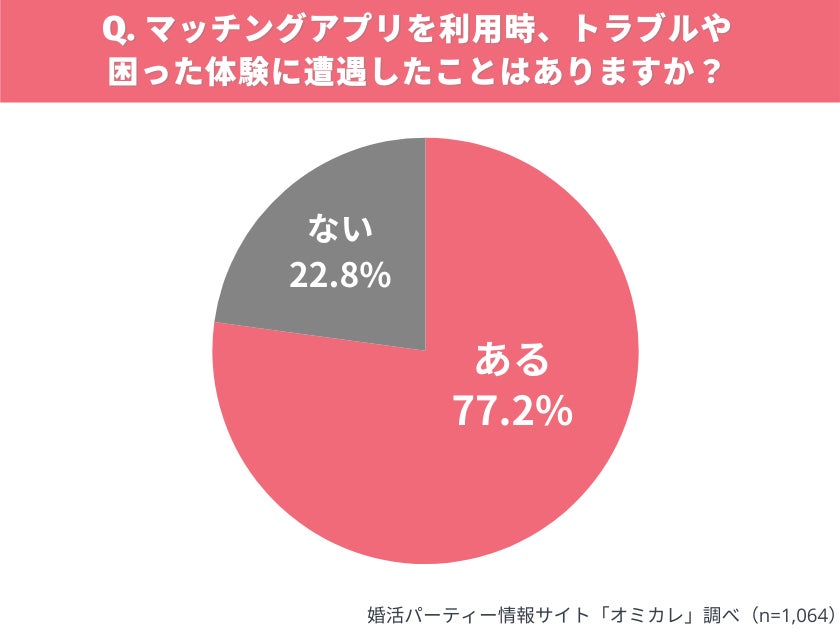 全体の77%以上になる821名が、マッチングアプリでトラブルへの遭遇・困った体験をしたと回答。