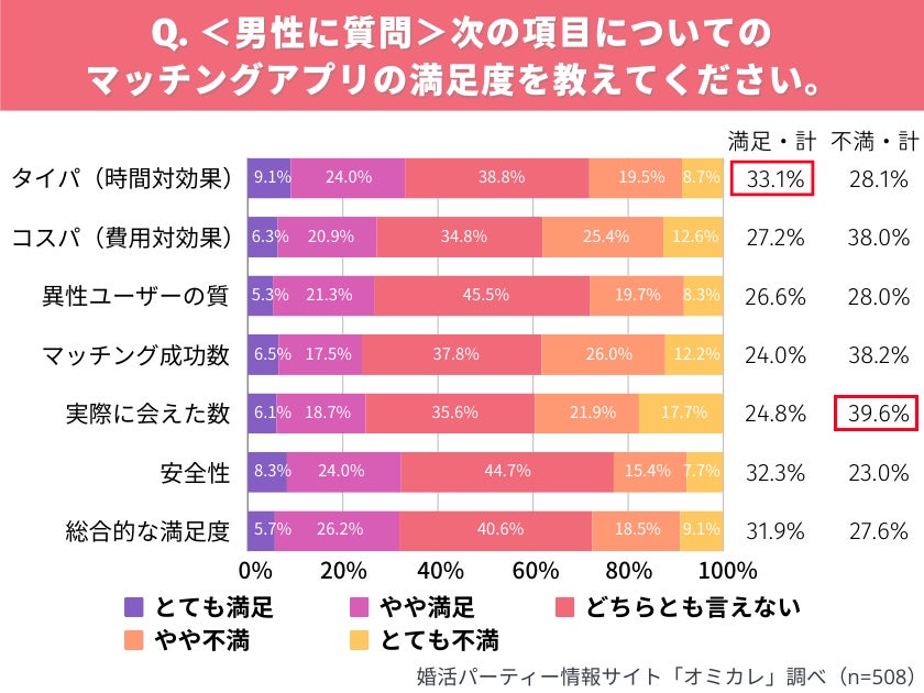 マッチングアプリが、「いいね」などのアプローチ→マッチング→アポイントメント→デート…と段階を踏まなければ実際に会えないのに対し、婚活パーティー・街コンは参加さえすれば複数の異性と実際に会えることから「実際会えた数」への満足度が高いと考えられます。
