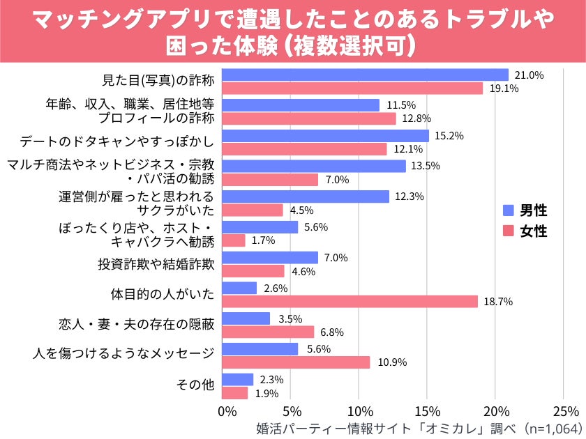 男女ともに「見た目(写真)の詐称」が最も多い結果となりましたが、「マルチ商法やネットビジネス・宗教・パパ活の勧誘」といったトラブルに巻き込まれた男性は14%程度おり、お金儲け目的のユーザーによる被害が少なくないことがわかります。