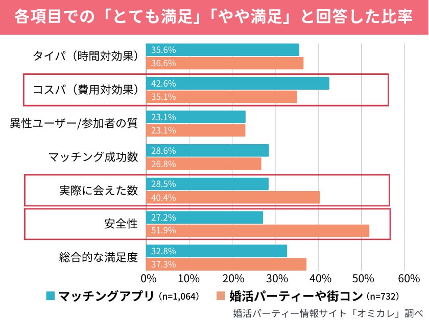 一方、「実際に会えた数」「安全性」の満足度については、婚活パーティー・街コンが優位な結果となりました。