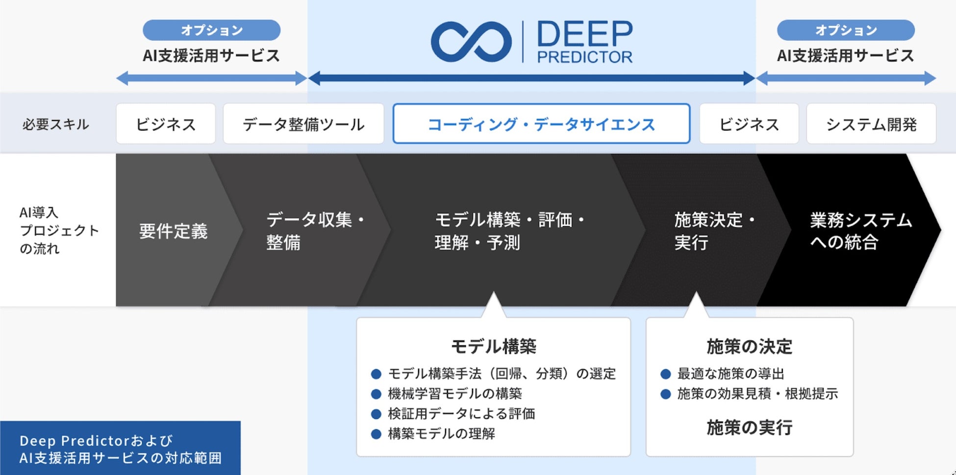 Deep Predictorは、従来データ・サイエンティストが行っていたAI分析を、直感的なユーザーインターフェースで誰でも簡単に実行できるノーコードAI予測分析ツールです。高精度な予測分析や最適な施策、その効果や根拠を得ることで、マーケティング、営業、顧客サポート、生産管理など多くの分野で効率的に活用できます。