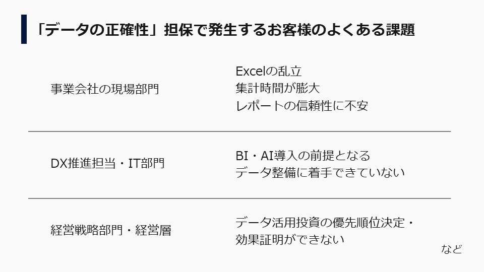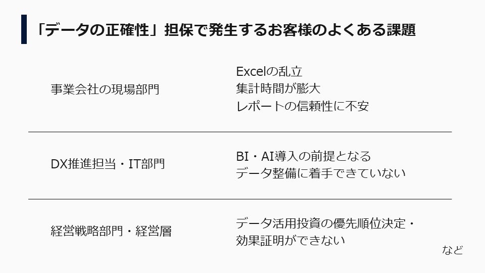 しかし、これまで多くの企業ではエクセルなどを使って手作業で属人的にデータを収集、分析しており、データの不整合が頻繁に発生していました。また現在では、クラウドツールのほか、各種アプリ、データベース、広告ツールなど、多様なソースから情報を統合して分析する必要があり、データ管理はますます複雑化しています。こうした企業の「分析の前にデータ品質を担保したい」という高いニーズを背景として、今回のサービスをご提供することとなりました。