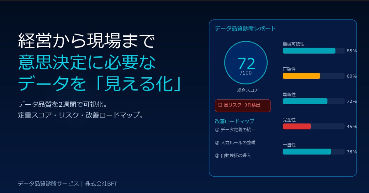 「人とシステムをつくる会社」を理念に企業向けシステムコンサルティング・構築を行う株式会社BFT(東京都千代田区:代表取締役 小林 道寛)は、このたび、売上や顧客データなど経営判断を支える各種蓄積データの品質を改善し、戦略的活用を可能にする支援サービス「BFT Insight」(Quick・Standard・Premiumプラン)を提供開始いたします。なお、先着20社まで、DX推進を伴走型で実現する当社のITよろず支援サービス~YOROZU~を通して「Quickプラン」(データ品質診断)をお申し込みいただくと価格が半額となります。