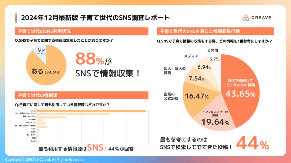 クリエイターとの共創を通じて企業のマーケティング課題を解決する、株式会社CREAVE(本社:東京都千代田区、代表取締役社長:中村真奈、以下 CREAVE)は、子育てに関する消費者のSNS行動を調査した「2024年12月最新版 子育て世代のSNS調査レポート」を12月10日(水)に公開しました。
