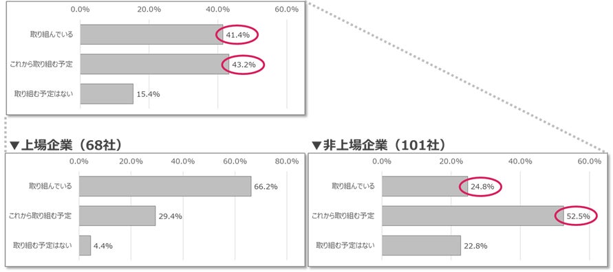 ♦人的資本開示に『取り組んでいる企業』は全体で約4割、『これから取り組む予定』を含めると8割を超え、さらに非上場企業でも関心が高まっている。