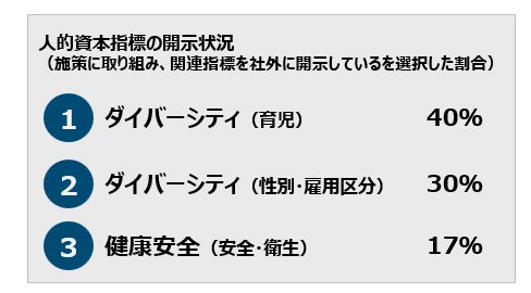 多くの企業で開示に向けて動きだしているものの、『ダイバーシティ(育児)』、『ダイバーシティ(性別・雇用区分)』などの法定開示項目への対応にとどまっており、企業独自の指標や施策に取り組んでいる企業は少ないこと、また『経営戦略と人事戦略の連動ができていない』、『独自の指標の検討・施策に繋げることが難しい』などが課題としてあげられており、人的資本経営への取り組みとしては、まだ道半ばの状況となっている。