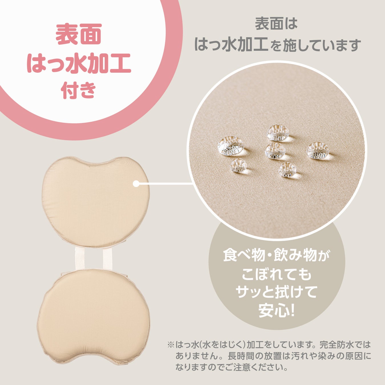 表面には撥水加工を施し、食べ物や飲み物がこぼれてもサッと拭きとることができます。洗濯ネットを使用し手洗い・ソフトモードでのお洗濯も可能です。