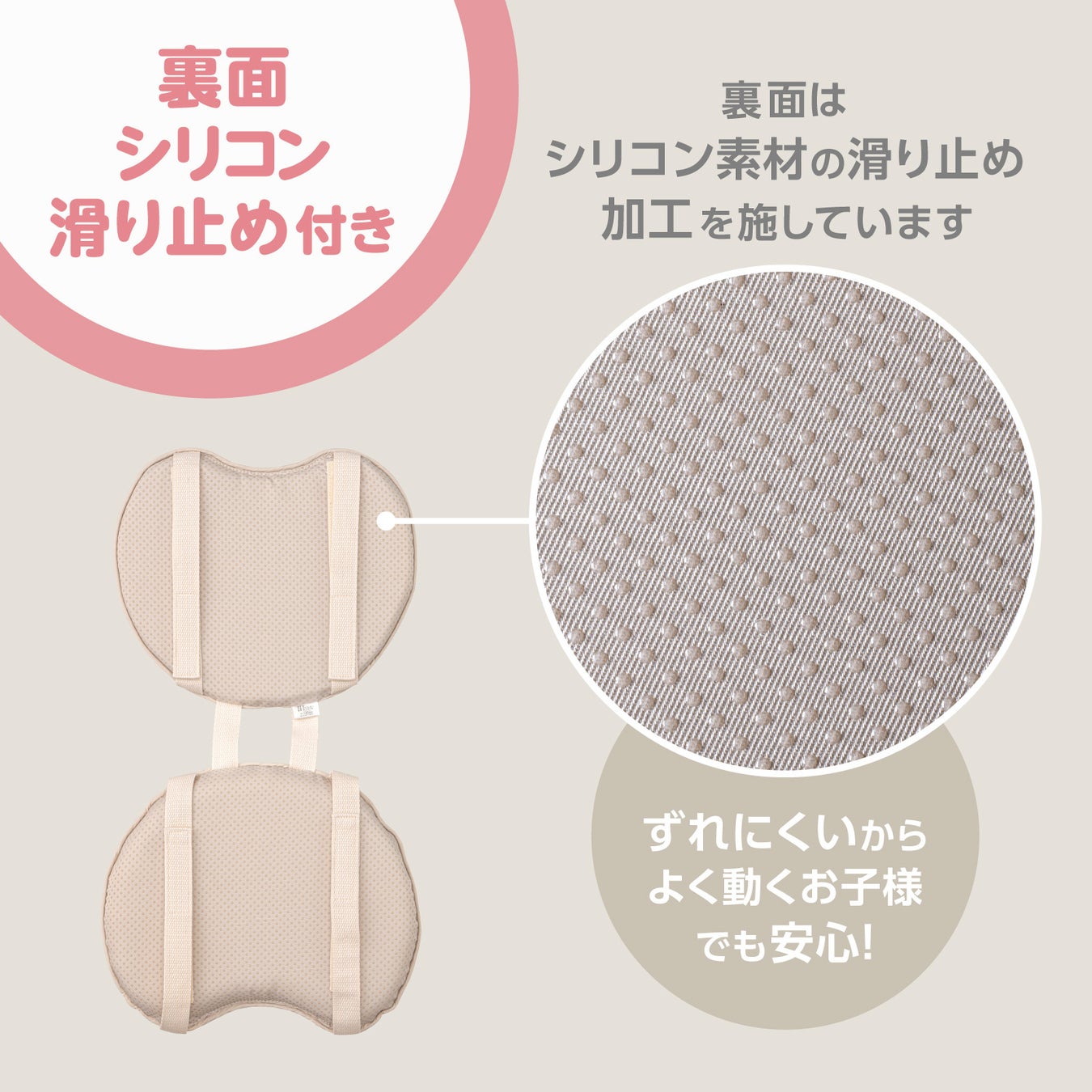 取り付けはマジックテープで簡単にしっかり固定でき、裏面に滑り止めが付いているのでよく動く子供でもずれにくく安心して使うことができます。