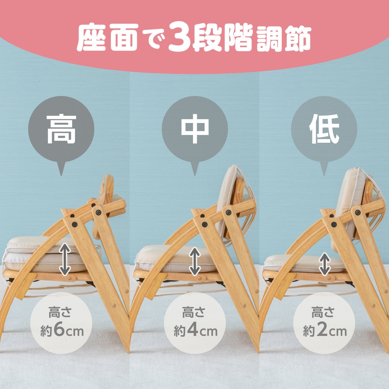 厚み2cmと4cmの2つのクッションを付け替えることで、椅子の形状や子供の成長に合わせて座面の高さを3段階に調節が可能です。