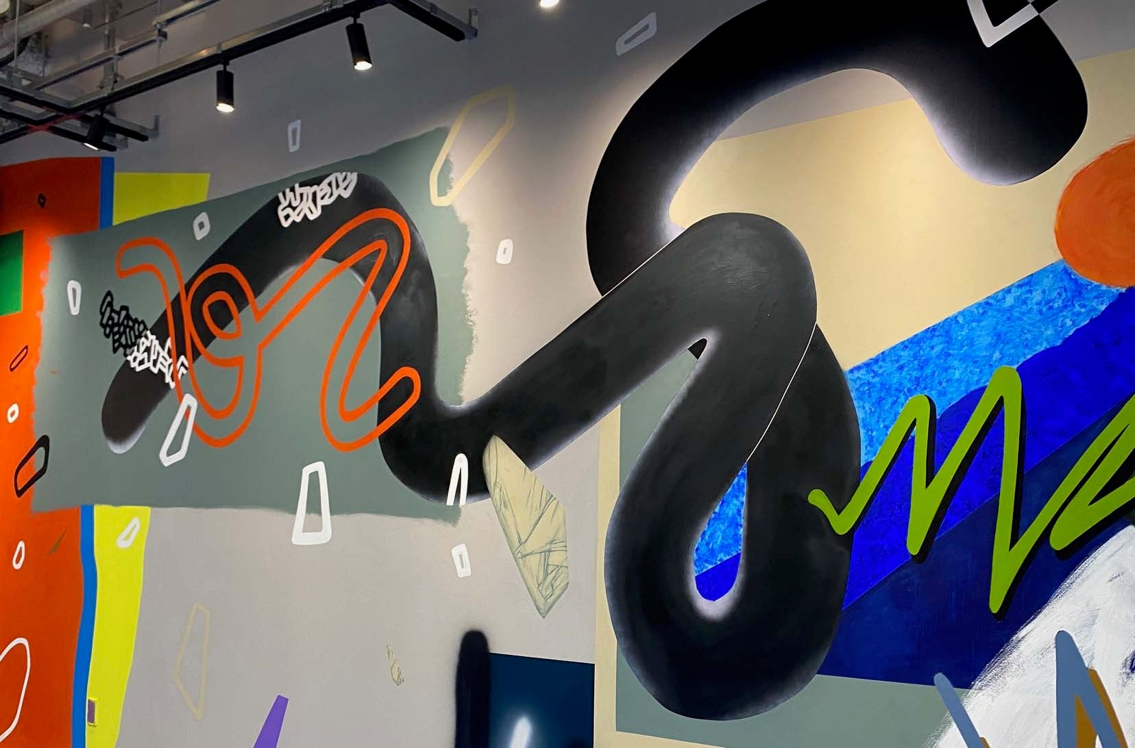 作品紹介:フィットネスジムの壁画(作品名「In Motion(イン・モーション)」)では、“動き”をテーマに細胞から経済の大きな流れまでを抽象的に描写した大型壁画。黒いラインはエネルギーや循環を表し、散らばる色や形が粒子のように広がり、金融街兜町から世界の市場へとつながるイメージを表現している。