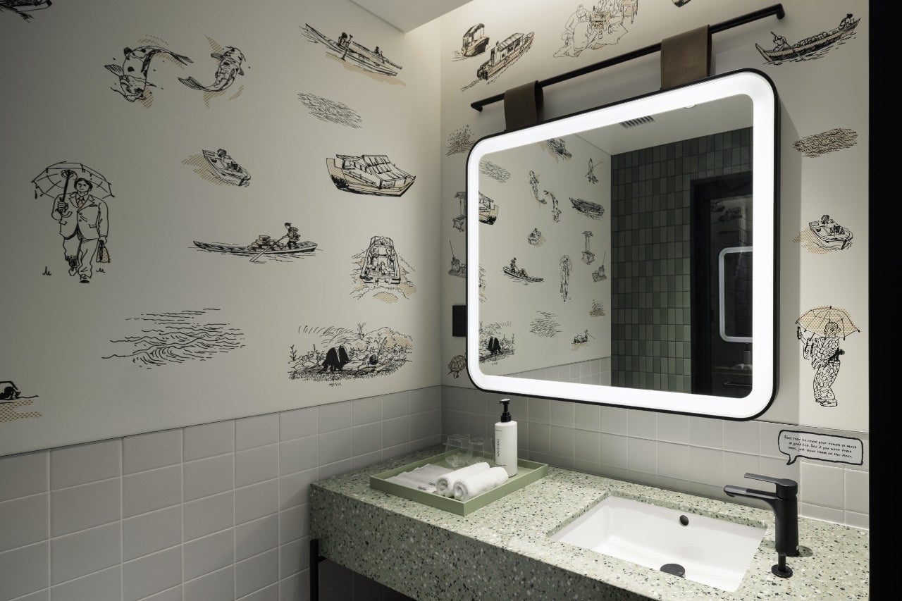 作品紹介:本ホテルでは、街の風景や人々の営みを軽快で温かみのあるタッチで描き、客室バスルームや1階のギャザリングスペース、エレベーターホールに展開。兜町の日常の息づかいを表現し、ゲストを街とつなげる。