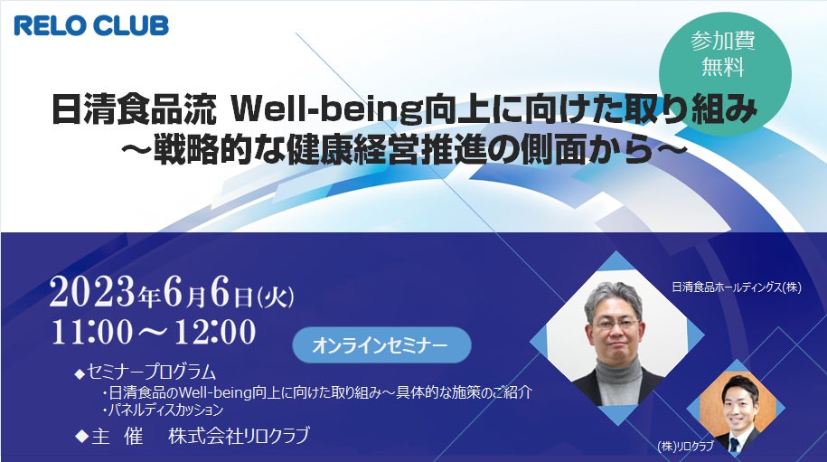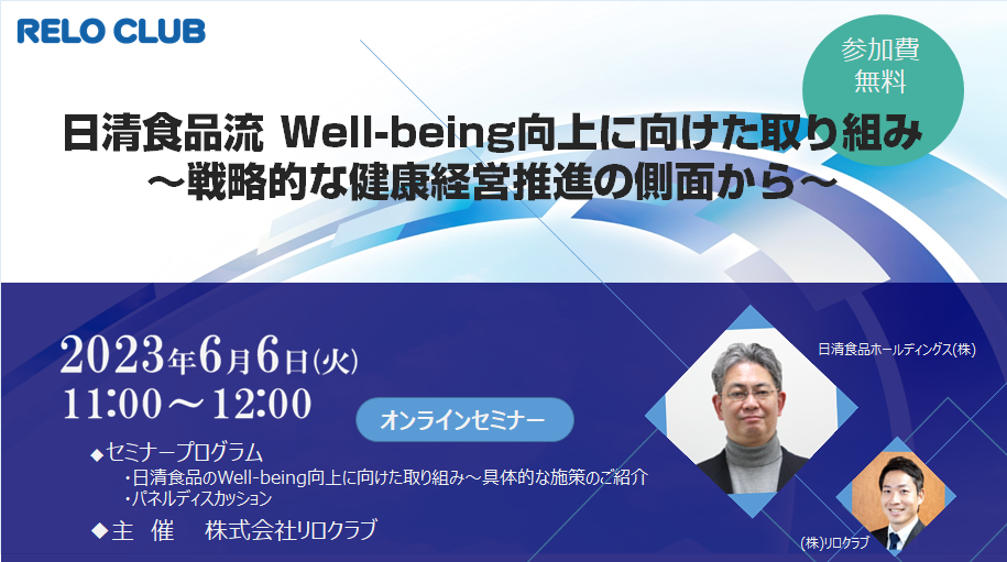 福利厚生アウトソーシングサービスのトップカンパニーである株式会社リロクラブ(本社:東京都新宿区、代表取締役社長 岡本 盛 https://www.reloclub.jp/)は、『日清食品流Well-being向上に向けた取り組み~戦略的な健康経営の側面から~』を2023年6月6日(火)11:00~ オンライン開催いたします。