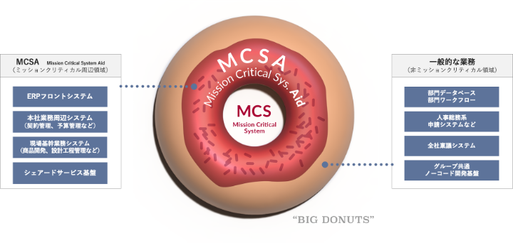 ドリーム・アーツの掲げる「ミッションクリティカル領域のシステム(MCS)を支える」というコンセプトのこと。Support(サポート)ではなくAid(エイド)という表現を使用している理由は、Aidという言葉が「困難な状況にある人や組織を実践的に助ける」という意味を含むためであり、「BD(ビッグドーナツ)領域の業務デジタル化」に取り組む姿勢を示しています。 MCSは、企業や組織の存続に欠かせない業務を遂行するうえで重大なシステムです。 財務会計システム、人事労務システムなどが業種を問わず該当しますが、業種特有のMCAには金融機関の勘定系システム、製造業の生産管理システム、鉄道会社の運行管理システムなども挙げられます。MCSAの代表例にはこれらMCSを支える、ERPフロントシステムや契約管理業務や、現場期間業務システムとして工程管理システムなどが該当します。