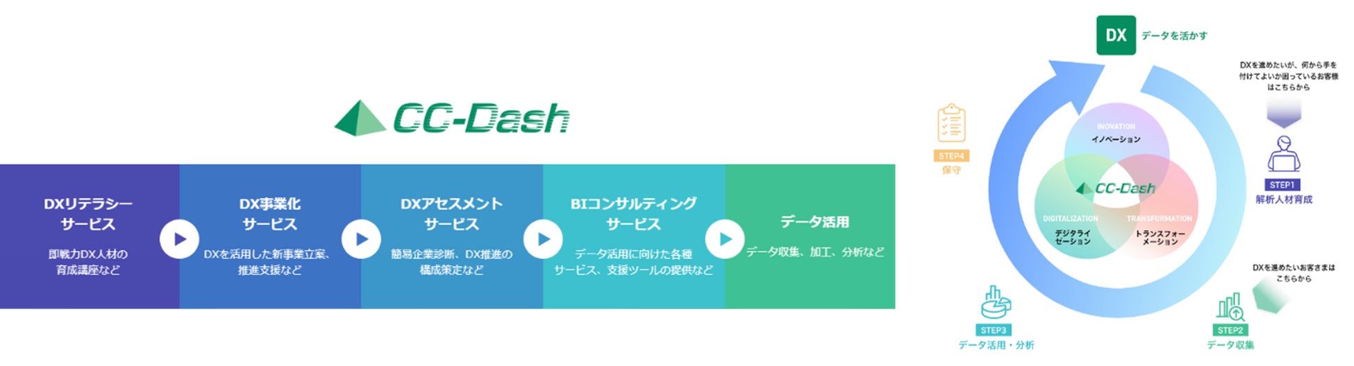 「CC-Dash」( https://xcc-dash.jp/ )は、データ活用によってお客様のDX推進を支援する当社独自のフレームワークです。DXを推進する際の各フェーズ(①知る ②つくる ③集める ④整える ⑤分析する ⑥活かす)における様々な課題に対し、テンプレート化と各種コンサルティングサービスをお客様に提供しています。加えてアライアンス等によってソリューションサービスのラインナップを随時追加・拡充していくことで、お客様のDX推進状況に合わせた支援策をワンストップで提供してまいります。