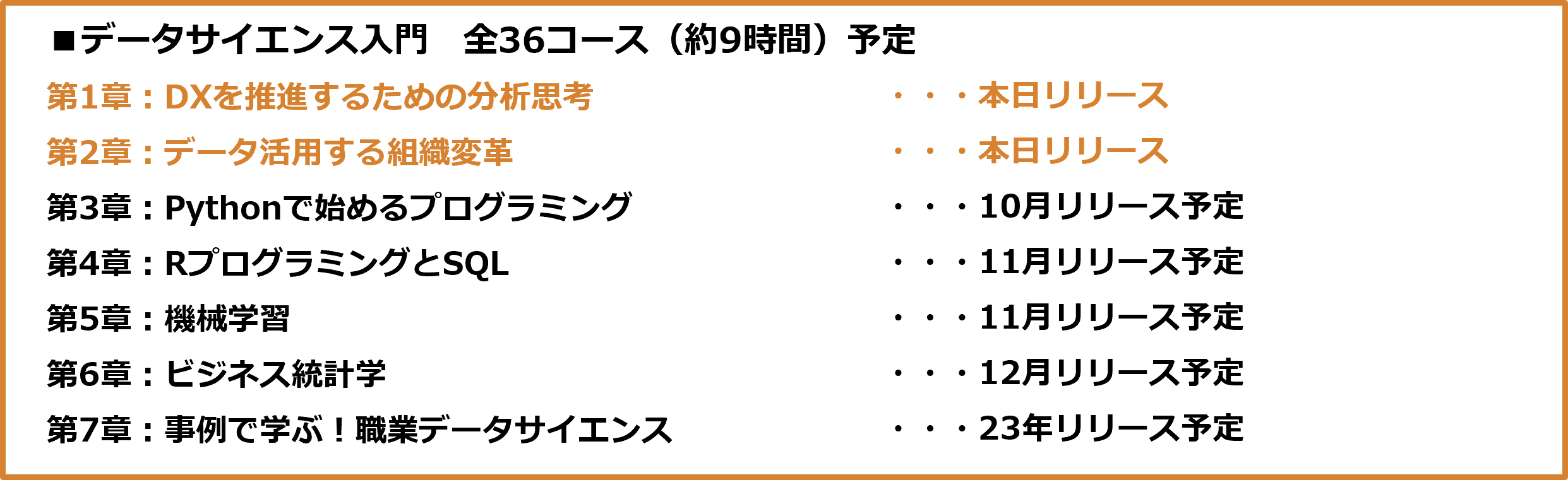 本シリーズは、データサイエンティスト育成の実績が豊富な株式会社データミックス(東京都千代田区、代表取締役:堅田洋資)と共同開発した、データ活用スキルやマインドセットを基礎から学べる入門シリーズです。DXのための分析思考や、機械学習、ビジネス統計学、プログラミングなど、初学者の方でも体系的に学習いただけるコンテンツとなっています。
