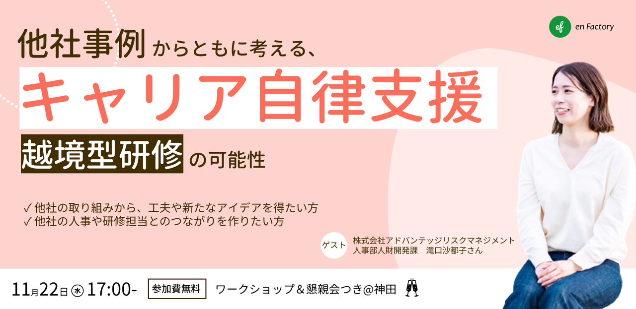 健康経営を支援するアドバンテッジリスクマネジメント 滝口様をゲストに『他社事例から学ぶ、これからの社員のキャリア自律支援~「越境型」研修の可能性~』人事のための越境ワークショップ&懇親会を開催します