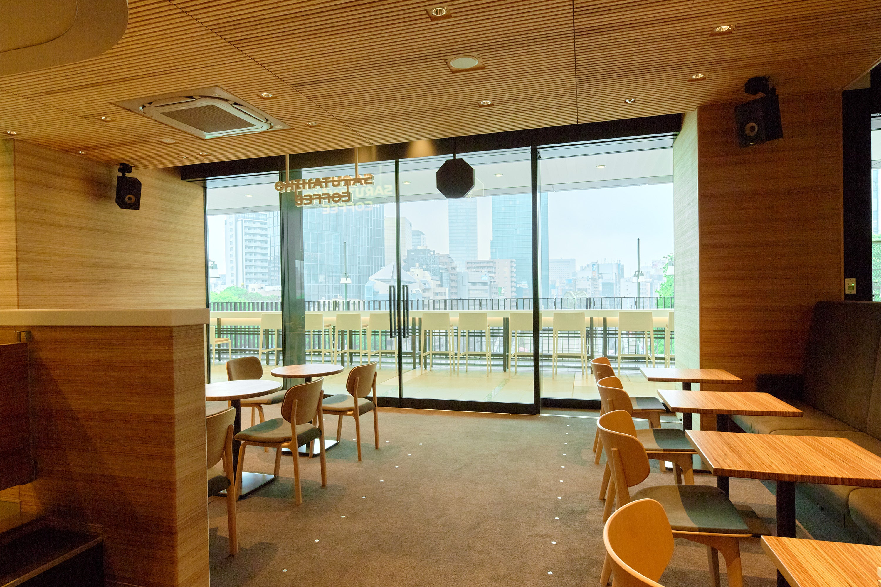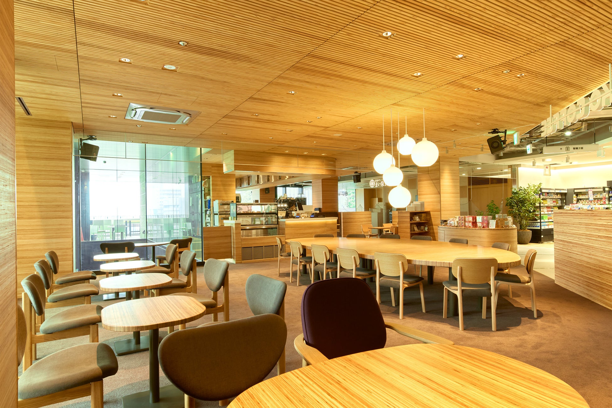 当店舗は、日本を代表する建築家の一人である内藤 廣(ないとう ひろし)氏が手がけました。約71席を備えた広々とした店内には、JR御茶ノ水駅をご利用される皆さまの多様なニーズにお応えできるよう、1名席から4名席まで幅広いタイプの座席をご用意しています。木材を基調としたこだわりの内装で、天井には、凹凸のある無垢の宮崎県産の杉材を採用。音を拡散させる効果とともに、吸音材を組み込むことで、会話や音楽が心地よく響く音環境を実現しています。