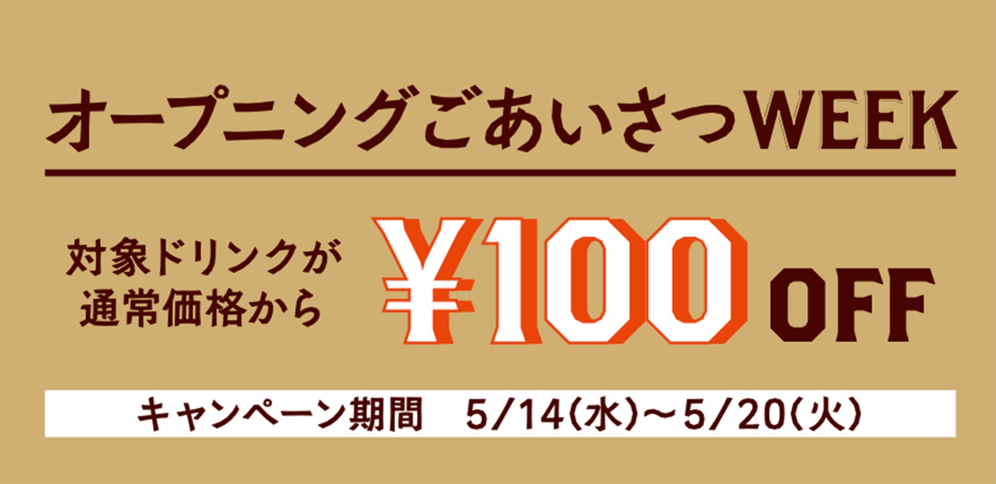 5月14日(水)〜5月20日(火)は、対象ドリンク全品100円引きの特別週間。