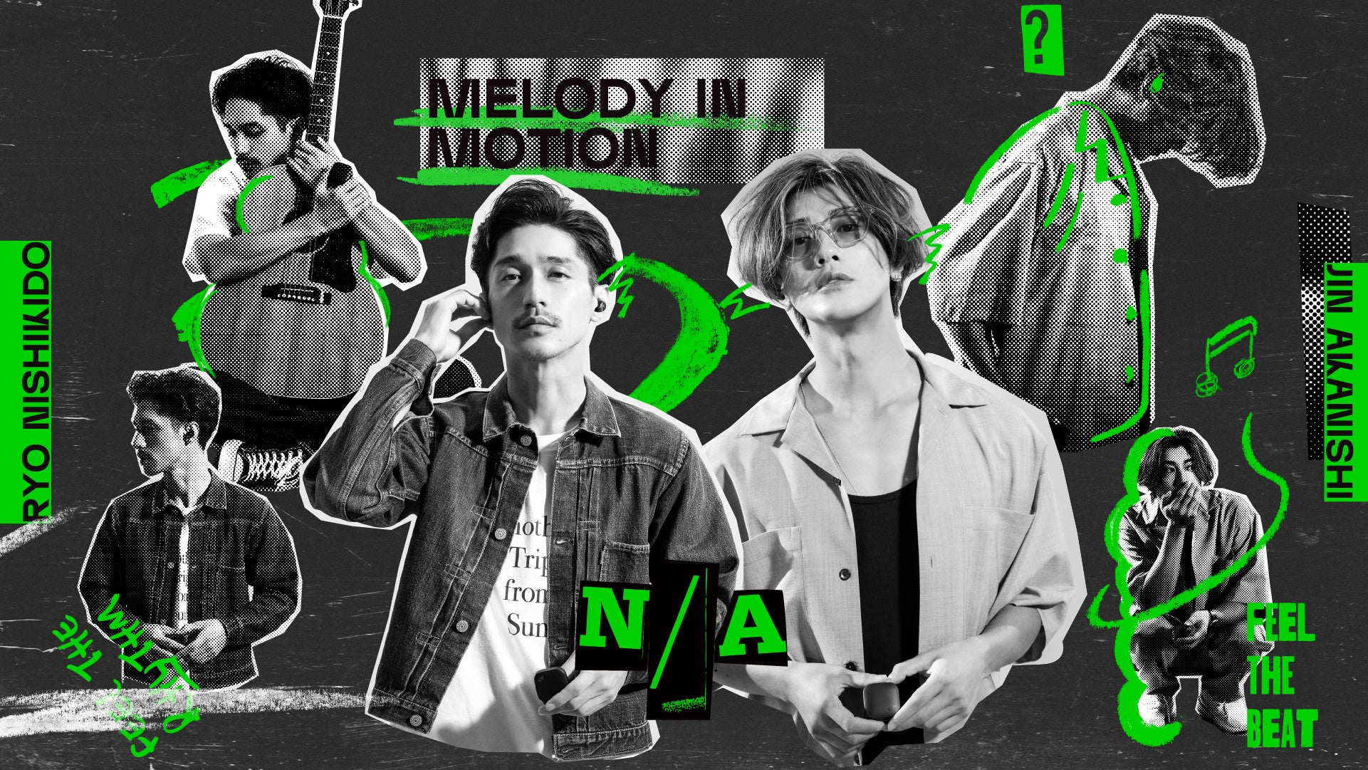 音楽を楽しんでいる二人の自然体の姿を、クールで遊び心のあるフォトコラージュで表現した特別なパッケージ。N/Aらしいブラックをベースに、差し色としてエネルギッシュなネオンカラーをあしらい、”いま”の二人らしさを反映しました。