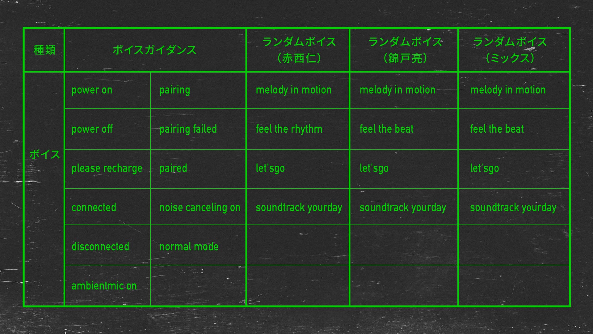 さらに新たな機能として、イヤホンのボタン長押しでランダムに再生される「ランダムボイス機能」を搭載。“melody in motion“などのランダムボイスのセリフは、「みなさんにもっと音楽を楽しんでほしい」という想いのもと、二人にご提案いただきました。