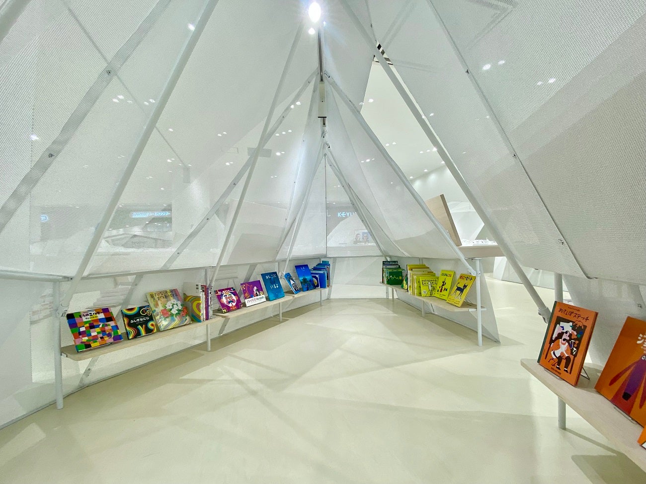 愛知県内24店舗目となる「JINS イオンモール豊川店」は、JINS店舗最大となる126.97坪を有し、広々とした空間で様々な“出会い”を演出します。店舗設計は、建築家の平田晃久氏が担当。「雲の中に浮かぶメガネと出会う」をコンセプトに、雲に見立てて特殊な樹脂で製作した什器を不規則に配置。まるで雲の中を巡っているような空間が、お気に入りのメガネと出会うまでのひと時をワクワクさせてくれます。また、店内には約1,200冊の書籍を陳列※2。どなたでも気軽に手に取っていただくことができ、お気に入りの一冊との出会いを創出します。一部の雲の什器は子どもがくぐって入ることができ、中で書籍を読むこともできる楽しい設計です。