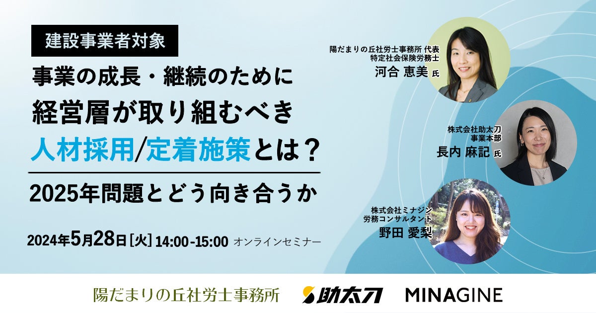 本セミナーでは、これまで建設事業者の労務問題を多数解決してきた、陽だまりの丘社労士事務所代表の河合恵美氏をゲストにお招きし、事業の成長・継続のために経営層が取り組むべき人材採用と定着のための施策について、事例を交えながら解説いたします。
