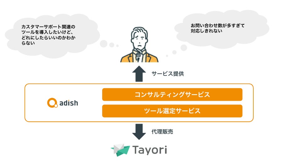 「Tayori」は、カスタマーサポートで重要となるお問い合わせの受け付けや管理、FAQによるお客様の疑問の自己解決を可能にします。一方で企業は、「FAQをどうやって作っていけばよいのか」「FAQをどう更新していけばよいか」「カスタマーサポート・カスタマーサクセス組織をどう立ち上げて運用していけばよいか」など、カスタマーサポートに関する様々な課題を抱えています。これらの課題を解決するために、アディッシュとTayoriでメニューを共同開発したプロフェッショナルサービスを、Tayori(PR TIMES)が販売、アディッシュがサービスを提供していきます。これによりTayoriの顧客は、カスタマーサポート・カスタマーサクセス領域の様々な課題を解決することが可能となります。