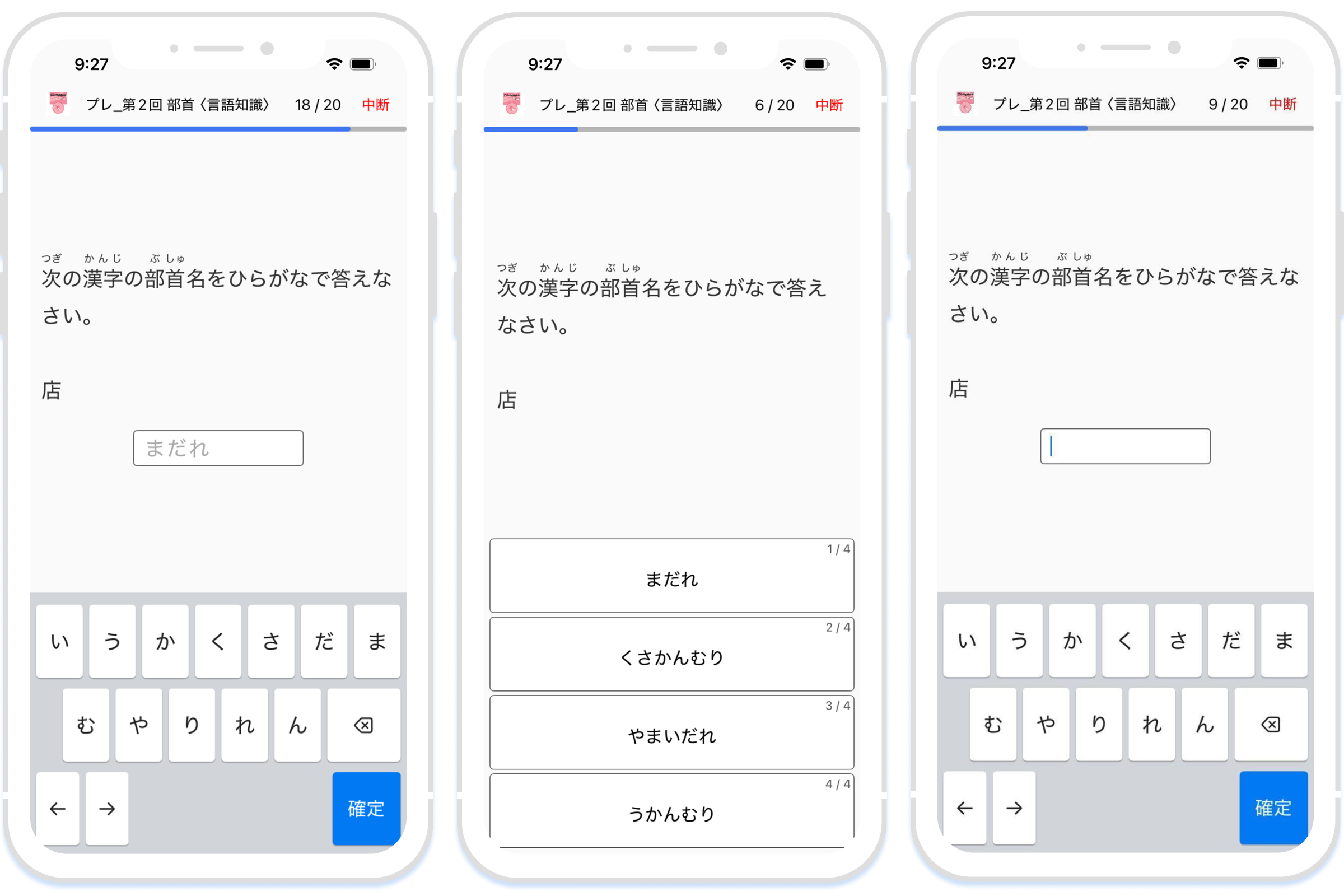 例えば漢字の部首に関する設問では、習熟度に応じて「ヒントあり」→「選択問題での回答」→「ヒントなしの回答」と段階的に難易度が上がる仕組みになっています。