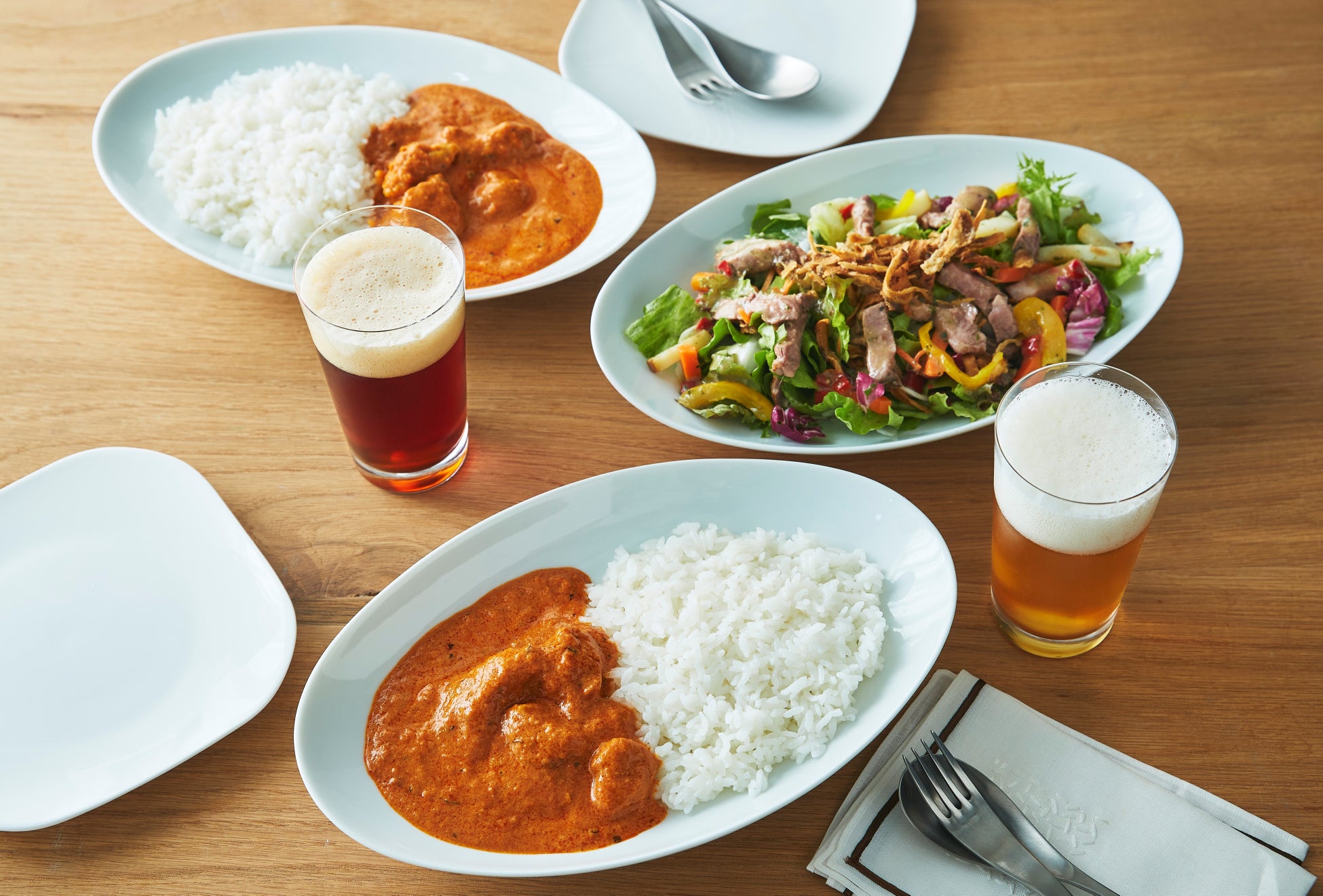 チキンの旨みはもちろん、トマトのまろやかなコクと優しい酸味を引きだした「バターチキンカリー」。ローストビーフと揚げごぼうに、ガーリックオイルが効いたソースがクセになる「キットサラダ」。この2品には、美しい赤色でホップ由来の苦味、柑橘系の香りが広がる「レッドエール」と、ホップの香りと爽やかな苦みの調和が楽しめる「ピルスナー」の2種のエチゴビールを合わせました。