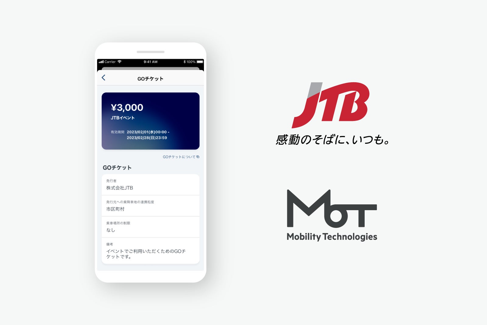 株式会社JTB(本社:東京都品川区、代表取締役社長執行役員:山北 栄二郎、以下JTB)と、株式会社Mobility Technologies(本社:東京都港区、代表取締役社長:中島 宏、以下MoT)は、MoTの「GOチケット」を活用した『デジタルタクシーチケットfor Events』を、2023年2月1日(水)より提供開始します。JTBが持つMICE※領域における高い専門性とMoTのタクシーDXノウハウの融合により、MICEのDXサポートから広く交通パッケージの共同販売なども見据え、様々な移動課題の解決をはかるべく、協業を進めてまいります。