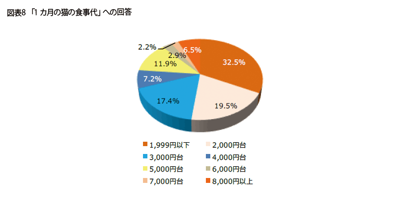 1カ月の猫の食事代は(図表8)、最多が32.5%の「1,999円以下」に。これを高いとみるか、安いとみるか、意見が分かれるところでしょう。以下、「2,000円台」19.5%、「3,000円台」17.4%と、約7割が4,000円未満と回答。「8,000円以上」という人も6.5%いました。
