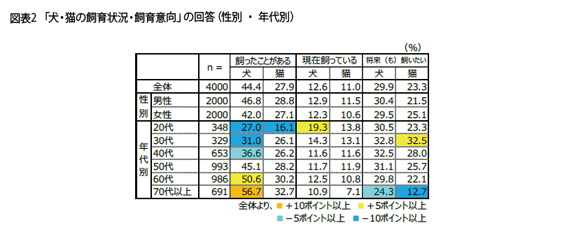 犬と猫をどれくらいの人が過去・現在に飼った経験があり、今後飼ってみたいと思っているのかも聞いてみました(図表2)。“現在飼っている” は犬12.6% vs 猫11.0%と差が小さいですが、“飼ったことがある” は犬44.4% vs 猫27.9%、 “将来(も)飼いたい” 29.9% vs 23.3%と犬が優勢に。これを年代別にみると、“現在飼っている” は犬・猫ともに20代・30代が全体よりも高値を示しており、若者は動物好きなのでしょうか。全般に犬優位のなか、40代は11.6%と両者同率、50代は11.7% vs 11.9%とわずかながらも猫の方が多く、働き盛り世代は家で猫に癒されているのでしょうか。 “将来(も)飼いたい” では、30代で32.8% vs 32.5%と両者が拮抗しました。