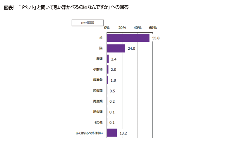 あなたは「ペット」と聞いて、なにを思い浮かべるでしょうか。これを4,000人にたずねたところ(図表1)、55.8%と半数以上が回答したのが「犬」、24.0%の「猫」がこれに続きました。3位以下(「あてはまるペットはいない」を除く)の合計が7.1%にとどまることからも、犬と猫は “ペットの二大巨頭” と言えそうです。
