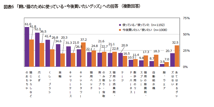 猫を “お迎え” すると、あれこれとグッズを買いそろえたくなるもの。そこで、食器などの必須なもの以外で使っている/使っていたグッズをたずねてみました(図表6)。61.0%と最も多くの人が挙げたのは「猫じゃらしなどのおもちゃ」。一緒に遊ぶ以外にも、猫のストレス解消の点からも必須アイテムと言えそうです。次いで、家や家財を傷から守る意味もあってか「爪とぎ」52.3%、身だしなみのための「くし、ブラシ」41.4%、迷子時の対策にもなる「首輪」34.6%、外出や通院時に必須の「キャリーケース」31.3%となりました。