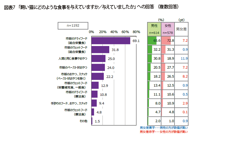 愛猫の健康を保つうえで基本となるのが食事でしょう。店頭には多種多様なキャットフードが並び、どれを選べばよいのか迷うほどです。そんななか、猫にどんな食事を与えているのか聞いた結果が図表7です。69.1%と最も多かったのが「市販のドライフード(総合栄養食)」。比較的安価でバランスよい栄養が手軽に摂れる “カリカリ” を7割が愛用していました。これに続くのが、カリカリと比べて食いつきのよい「市販のウェットフード(総合栄養食)」31.8%。さらに「人間と同じ食事やおやつ」も25.0%に。昔ながらの “ねこまんま” を与えているのか、はたまた飼い主と一緒に高級食材を楽しんでいるのか、気になります。最近話題の「市販のペースト状おやつ」は24.0%と、「市販のおやつ、スナック(ペースト状おやつを除く)」22.2%を上回り、女性を中心に人気のようです。「手作りのフード、おやつ、スナック」を与えている人も9.4%いました。