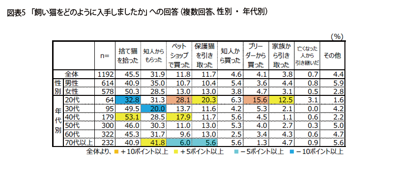 今回は猫を現在飼っている・飼ったことがある人に、さまざまなことをたずねてみました。まずは、猫を飼い始めた理由は(図表4)、基本ともいえる「猫が好きだから」が50.7%と半数に。これに、「拾ったから」21.6%、「家族・子どもが飼いたいと言ったから」20.0%と受動的な理由が続くのは興味深いですね。どのように飼い猫を入手したかも聞いたところ(図表5)、買い始めた理由2位の「捨て猫を拾った」が45.5%で最多に。これに「知人からもらった」31.9%、「ペットショップで買った」11.8%、「保護猫を引き取った」11.7%が続き、全般的に “買う” よりも “もらう” “引き取る” ケースが多いようです。Vol. 178で調査した犬の入手経路ベスト3は(図表非掲示)「人からもらった」44.6%、「ペットショップなどで買った」29.7%、「拾った」14.8%であることから、犬と猫では様相が違うようです。年代別にみると、20代では全体と比べて「捨て猫を拾った」が32.8%と全体より低い一方で、「ペットショップ」や「ブリーダー」で買った、「保護猫」や「家族から」引き取ったが高位にあり、若年層は多様なルートから猫を入手していると言えそうです。