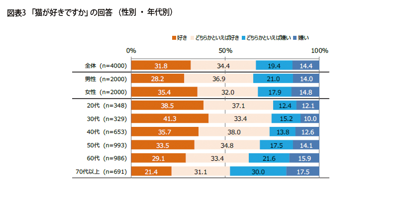 一般社団法人ペットフード協会の2022年調査では、犬と猫の飼育頭数はそれぞれ705万頭・883万頭と猫が上回ったように、近年は猫人気が高まっているという話も耳にします。そこでシンプルに “猫が好きか” をたずねたところ(図表3)、“好き派” (「どちらかといえば」を含む)66.2% vs “嫌い派” (同)33.8%と、前者が3分の2に。性別では “好き派” は男女ほぼ同率ですが、「好き」は女性が男性を7.2ポイント上回りました。また年代別では、世代が上がるほどに“好き派”は減っていき、70代以上では52.5%、「好き」も21.4%程度どまりに。片や40代以下では“好き派”が7割超、「好き」も30代の41.3%を頂点に50代以下で3分の1となりました。近い将来、“ペットと言えば猫” となるのでしょうか。