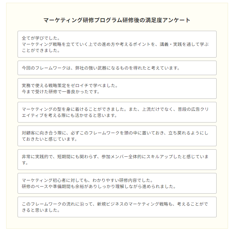 現場メンバーのマーケティングスキルを一段階あげたいと考える管理職の方や、これまで各人が自由演技でやっていたものを型化し、会社としての武器を作りたい企業におすすめしたいです。